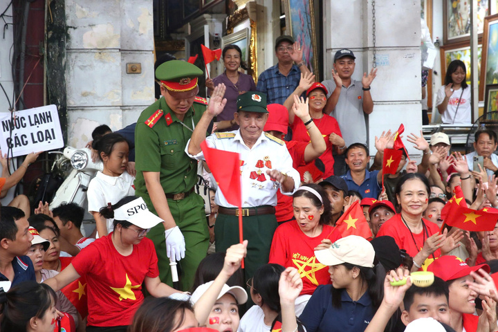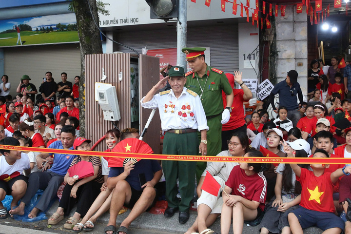 Cán bộ công an len lỏi vào đám đông, đưa cựu chiến binh lớn tuổi đứng ở vị trí thuận lợi để theo dõi trọn vẹn buổi tổng hợp luyện diễu binh, diễu hành.