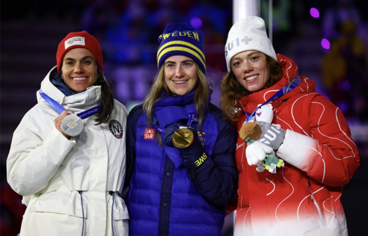 VĐV Thụy Điển Ebba Andersson giành HCV ăn mừng trên bục trao giải sau khi chiến thắng nội dung 50km xuất phát đồng hàng cổ điển nữ, cùng HCB Heidi Weng (Na Uy) và HCĐ Nadja Kaelin (Thụy Sĩ).