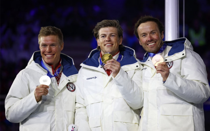 VĐV Na Uy Johannes Høsflot Klæbo giành HCV ăn mừng trên bục trao giải sau khi chiến thắng nội dung 50km xuất phát đồng hàng cổ điển nam, cùng HCB Martin Løwstrøm Nyenget (Na Uy) và HCĐ Emil Iversen (Na Uy).