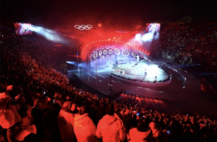 Các nghệ sĩ biểu diễn cùng biểu tượng Năm vòng tròn Olympic trong lễ bế mạc Thế vận hội Milano Cortina 2026.