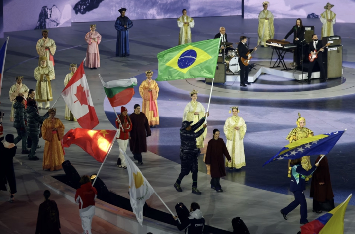 Người cầm cờ Edson Luques Bindilatti (Brazil) trong cuộc diễu hành vận động viên tại lễ bế mạc.