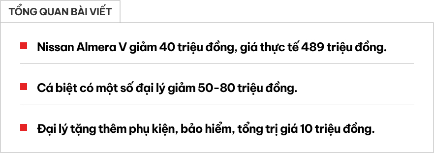 Nissan Almera phiên bản V đang được đồng loạt giảm giá 40 triệu đồng trên toàn quốc, đưa giá bán từ 529 triệu đồng xuống 489 triệu đồng. Tham khảo một số đại lý cho thấy, mức giảm có thể lớn hơn, khoảng 50 triệu đồng.