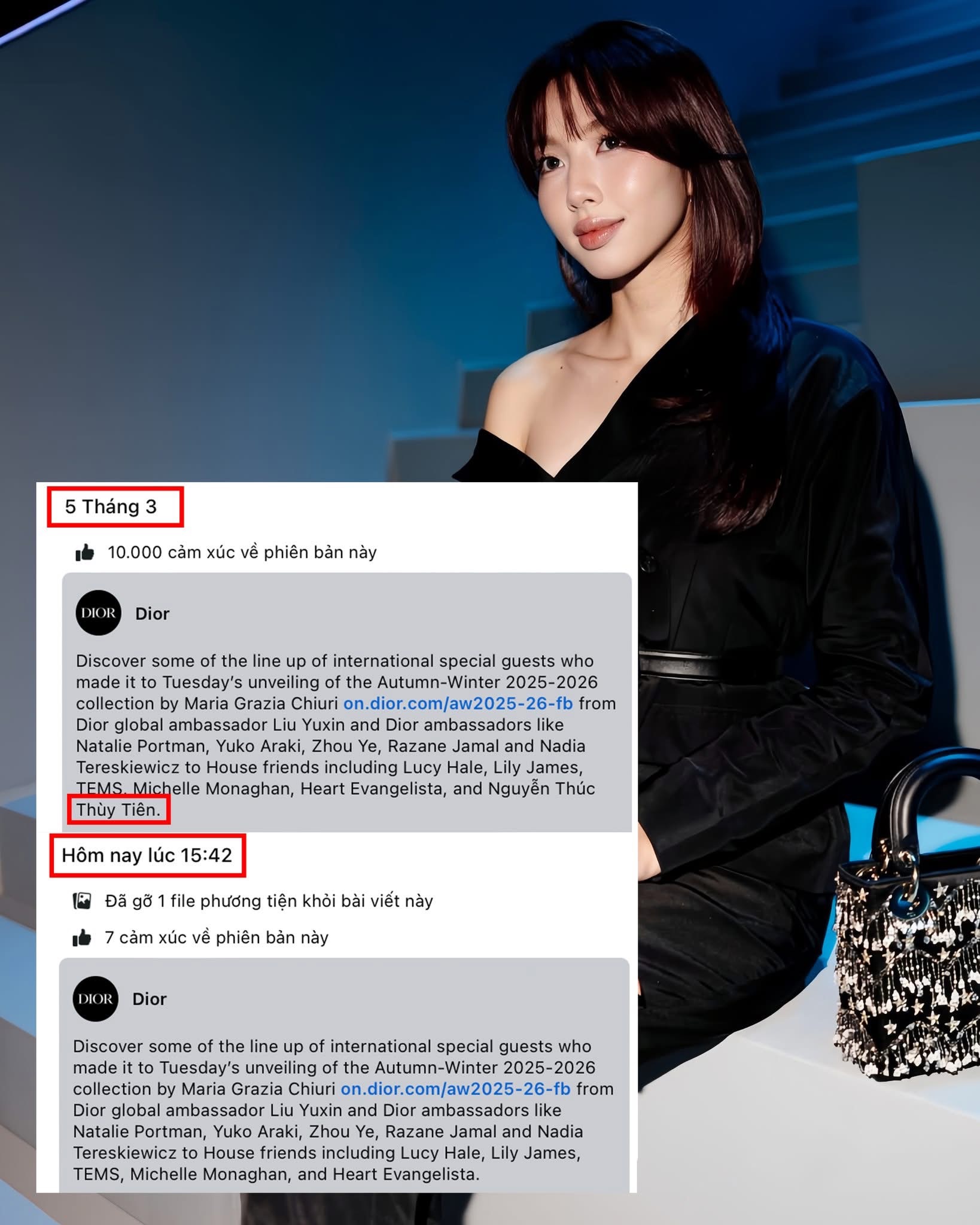 Đầu tháng 4, Fanpage chính thức hơn 20 triệu người theo dõi của Dior có động thái "xoá sổ" khi gỡ tag (gắn thẻ) và ẩn đi bức ảnh Thuỳ Tiên trong album dàn sao dự sự kiện tại Pháp. Cho đến tối 22/4, Dior bất ngờ có hành động gây bàn tán chính là khôi phục lại bức ảnh của Thuỳ Tiên "như chưa hề có cuộc chia ly" trên fanpage chính thức. Hiện tại, Dior hay Thuỳ Tiên đều chưa có thông báo liên quan đến việc làm này.