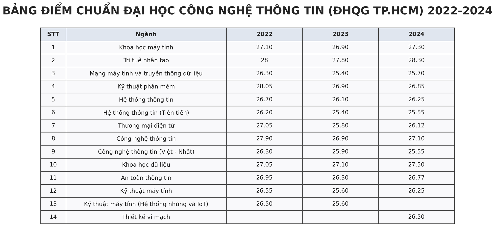 Trong giai đoạn 3 năm từ 2022 đến 2024, điểm chuẩn các ngành của Trường Đại học Công nghệ Thông tin (ĐHQG TP.HCM) nhìn chung có sự biến động nhẹ theo phổ điểm thi THPT từng năm. Năm 2023 ghi nhận mức giảm rõ rệt ở hầu hết các ngành so với năm 2022, sau đó phục hồi trở lại vào năm 2024.