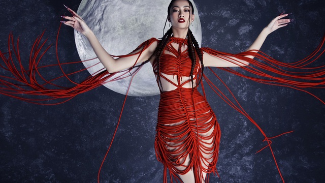 Hoa hậu Lương Thuỳ Linh mặc đầm kết từ 200 sợi dây đỏ