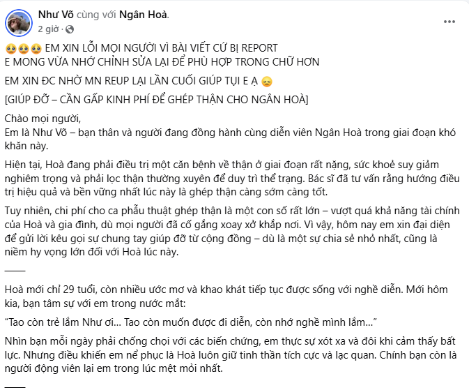 Mới đây, Như Võ, bạn thân của nữ diễn viên Ngân Hòa đã chia sẻ trên mạng xã hội về tình hình sức khỏe của nữ diễn viên,