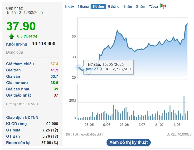 Trong vòng 3 tháng qua, cổ phiếu PVS đã tăng 46%, đóng cửa ngày 12/8 tại giá 37.900 đồng, tương đương hơn 18.000 tỷ vốn hóa thị trường.