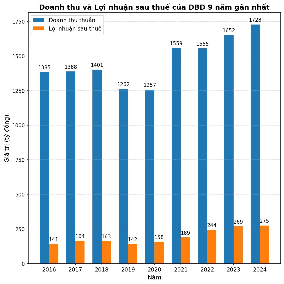 Năm 2025, DBD đặt mục tiêu doanh thu thuần đạt 2.000 tỷ đồng, tăng 10,1% so với cùng kỳ và lợi nhuận trước thuế đạt 335 tỷ đồng, tăng 3,1% so với cùng kỳ. Nếu đạt được, DBD tiếp tục chinh phục đỉnh lịch sử mới về doanh thu và lợi nhuận.