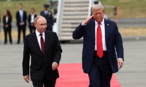 Tổng thống Vladimir Putin đã cùng Tổng thống Donald Trump đi chung xe đến điểm họp sau khi xuống sân bay tại Anchorage, Alaska.