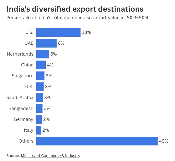 Các nhà kinh tế từng dự báo mức thuế nhập khẩu được công bố trước đó sẽ tác động “nhẹ” đến tăng trưởng kinh tế Ấn Độ. Vì quốc gia Nam Á này có mạng lưới thương mại đa dạng toàn cầu.