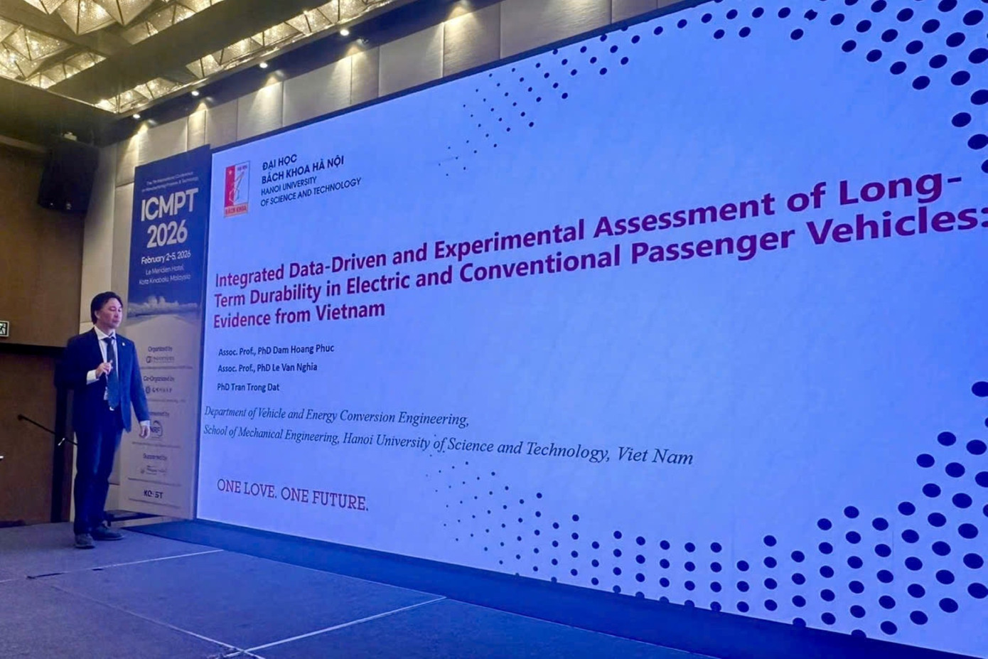 PGS. TS Đàm Hoàng Phúc trình bày báo cáo khoa học so sánh độ bền của xe xăng và xe điện tại hội nghị ICMPT 2026.