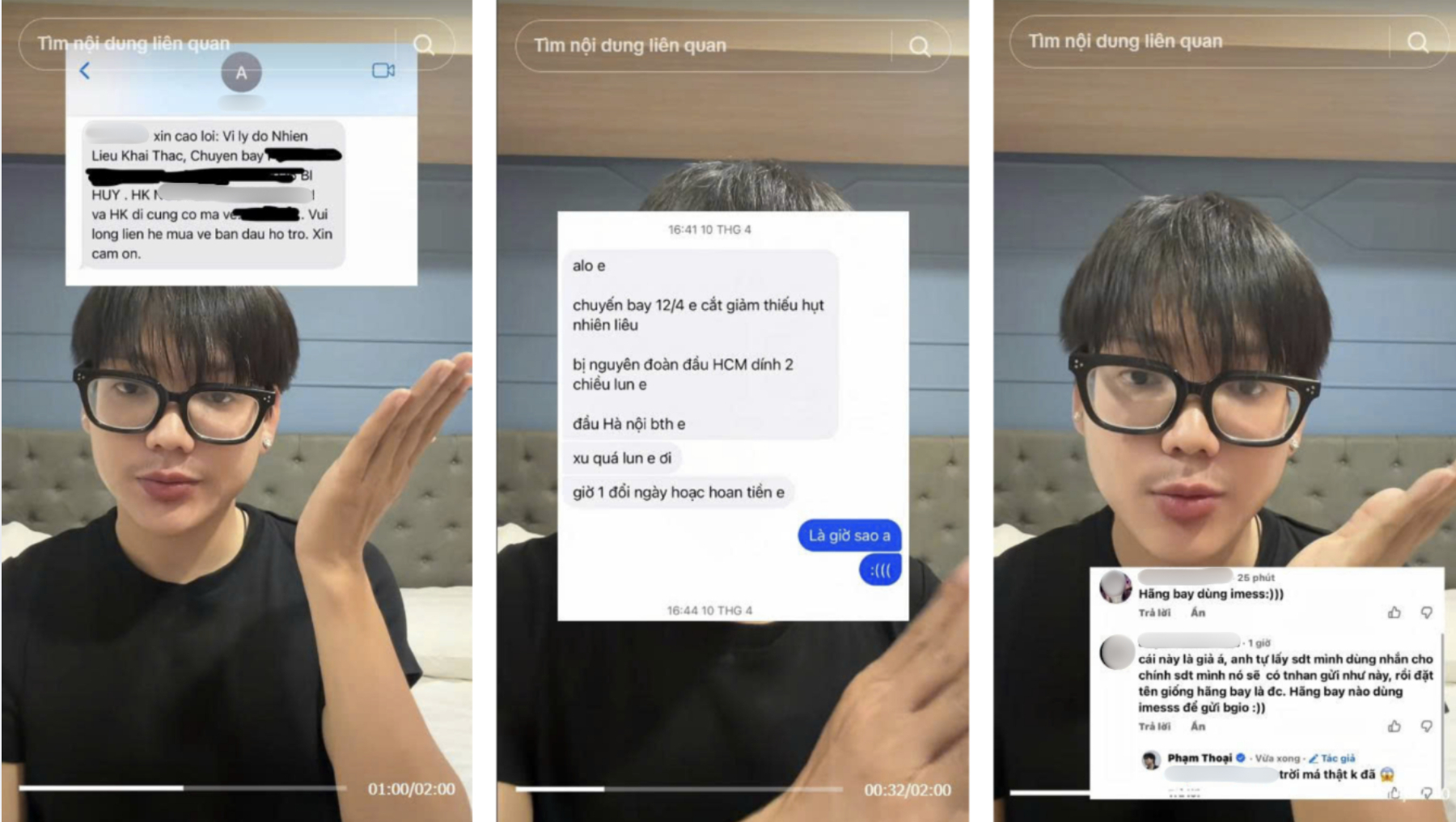 Bức xúc tột độ, nam TikToker đã tung loạt tin nhắn được cho là của hãng hàng không A do đại lý gửi để cộng đồng mạng phân xử. Ngay lập tức, hàng loạt điểm sơ hở của đại lý đã bị cộng đồng mạng bóc mẽ. Một hãng hàng không quốc tế lại gửi thông báo hủy chuyến bằng tiếng Việt sai chính tả lủng củng. Thêm vào đó, ảnh đại diện của người gửi lại là một tấm hình cá nhân mờ ảo cực kỳ thiếu uy tín. Nhiều người khẳng định đây thực chất là chiêu trò tự soạn tin nhắn rồi đổi tên danh bạ để qua mặt khách hàng trong lúc bối rối.
