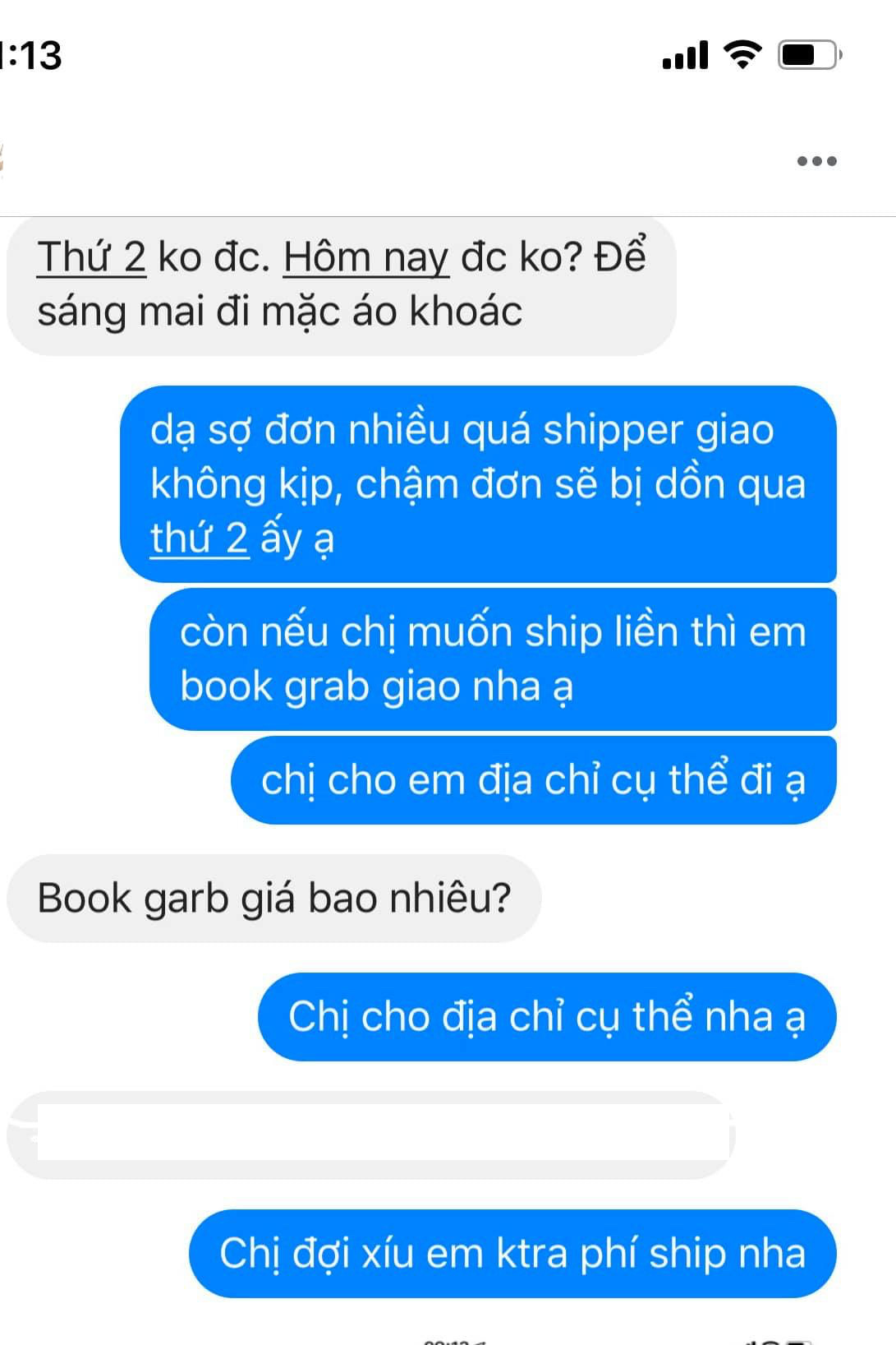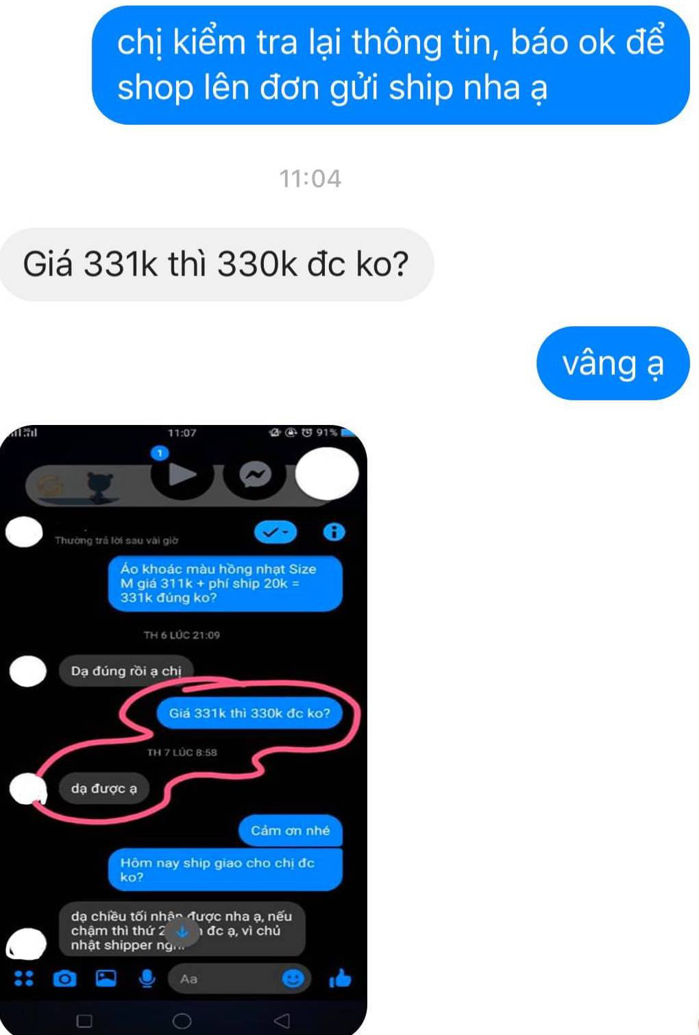 Kinh điển nhất là vị khách nằng nặc đòi giảm 1k tiền ship dưới đây, dù trước đó cô rất bạo tay order món đồ hơn 300k. Ngay sau khi đoạn tin nhắn này được tung lên MXH, nhiều người còn nhận xét cách nói chuyện của cô nàng này hẳn có vấn đề: cộc lốc, thiếu tinh tế đến ngỡ ngàng.
