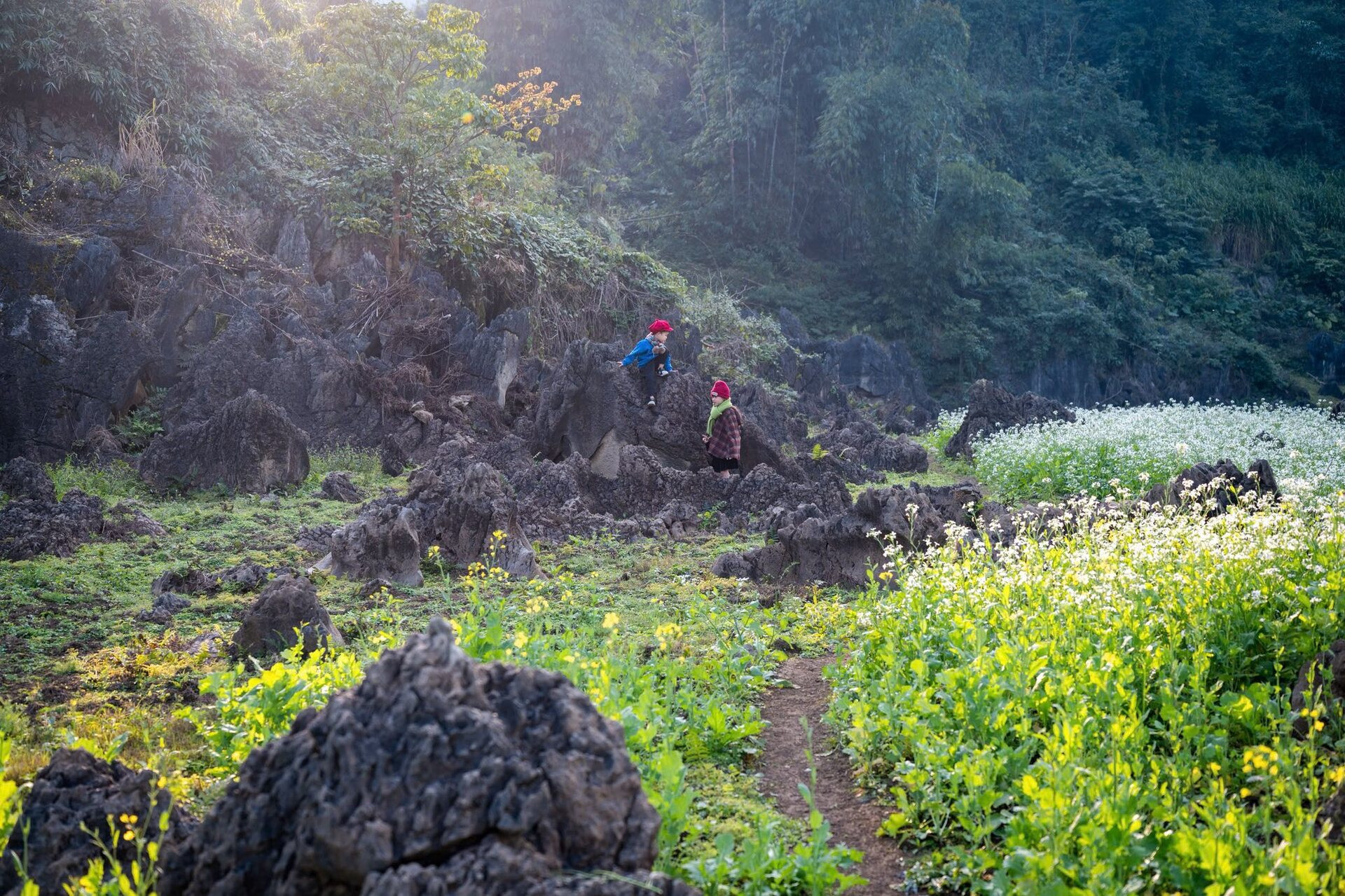 Tà Phình còn được gọi là “làng đá dựng” nhờ những mỏm đá lớn nhỏ dựng đứng giữa lòng bản, tạo thành một khung cảnh hùng vĩ. Đây cũng là nơi được nhiều du khách (và cả trẻ con trong bản) thích leo trèo, ngắm toàn cảnh từ trên cao. Nhìn thì chill đấy nhưng khi xem phim mới thấy không gian này làm rất tròn vai trong việc khiến khán giả cảm thấy “lạnh gáy’’.