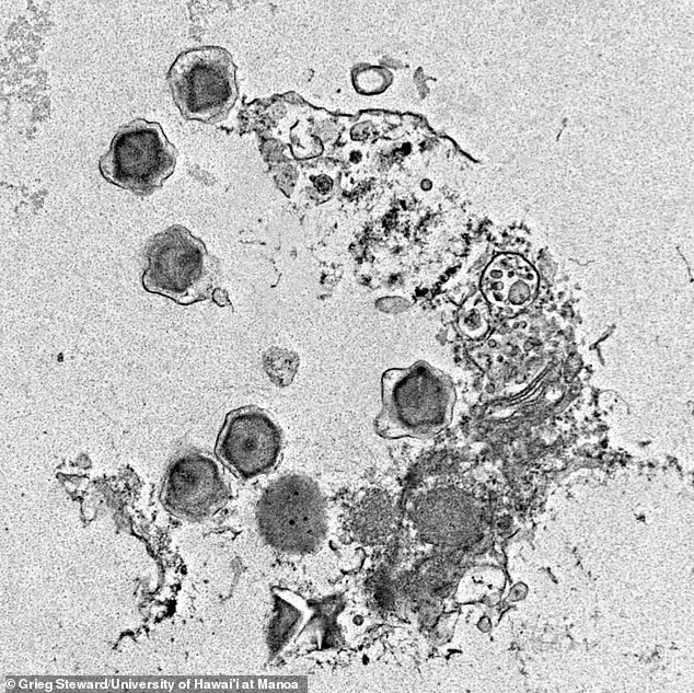 Một đợt nhiễm virus khổng lồ ở tảo đơn bào Florenciella. Các virus khổng lồ đang phá vỡ tế bào Florenciella, với các vỏ capsid hình lục giác bao bọc vật liệu di truyền của chúng.