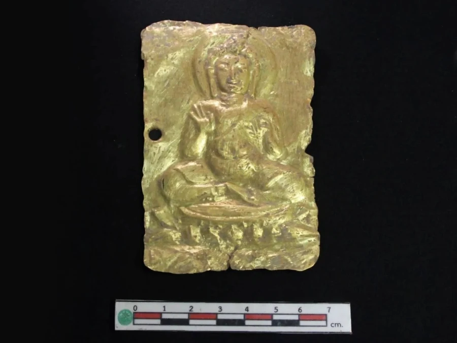 Tiếp sau phát hiện ban đầu, các nhà khảo cổ tiến hành khai quật sâu hơn và tìm thấy thêm 3 hiện vật quan trọng mang biểu tượng tôn giáo. Trong đó có một tấm phù điêu vàng miêu tả Phật ngồi kết già trên tòa sen, tay thể hiện ấn Vitarka Mudra – biểu tượng của giáo lý và trí tuệ.