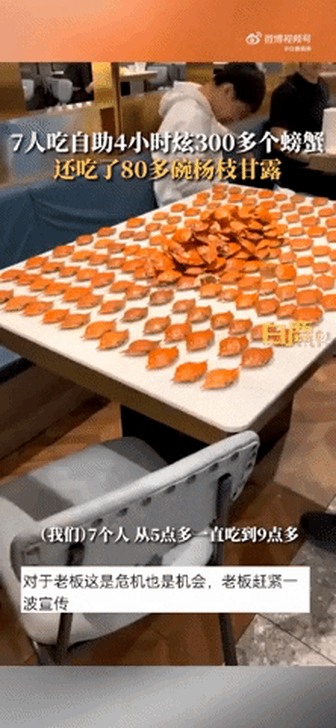 Một nhóm gồm 7 người tại Trung Quốc từng trở thành tâm điểm chú ý trên mạng xã hội sau màn “càn quét” buffet hải sản với khối lượng đồ ăn khiến nhiều người choáng váng. Trong hơn 4 tiếng đồng hồ, nhóm này đã dùng hết hơn 300 con cua, khoảng 80 chén chè tráng miệng, 50 hộp sầu riêng cùng rất nhiều tôm, cá hồi và các loại hải sản khác.