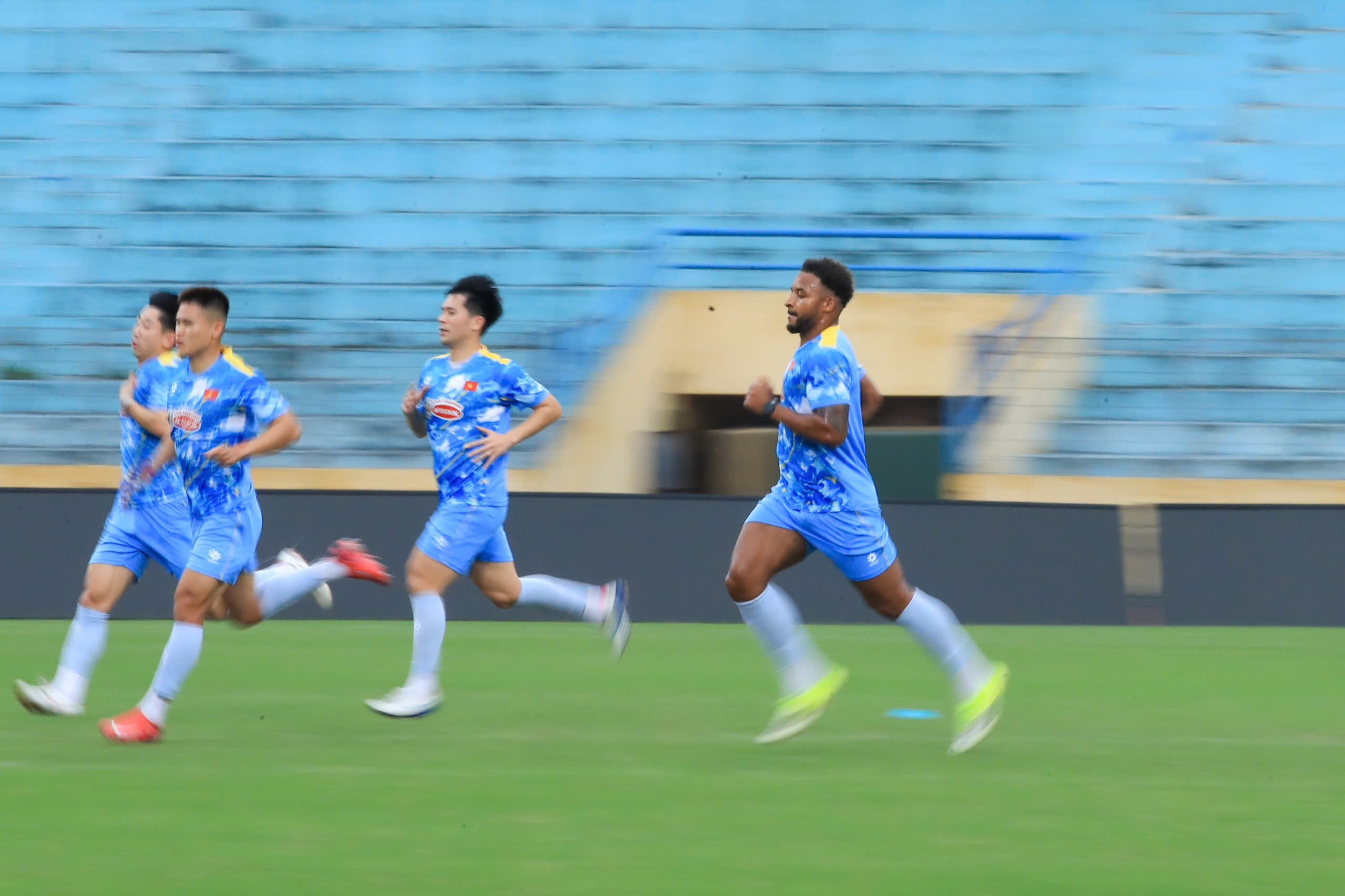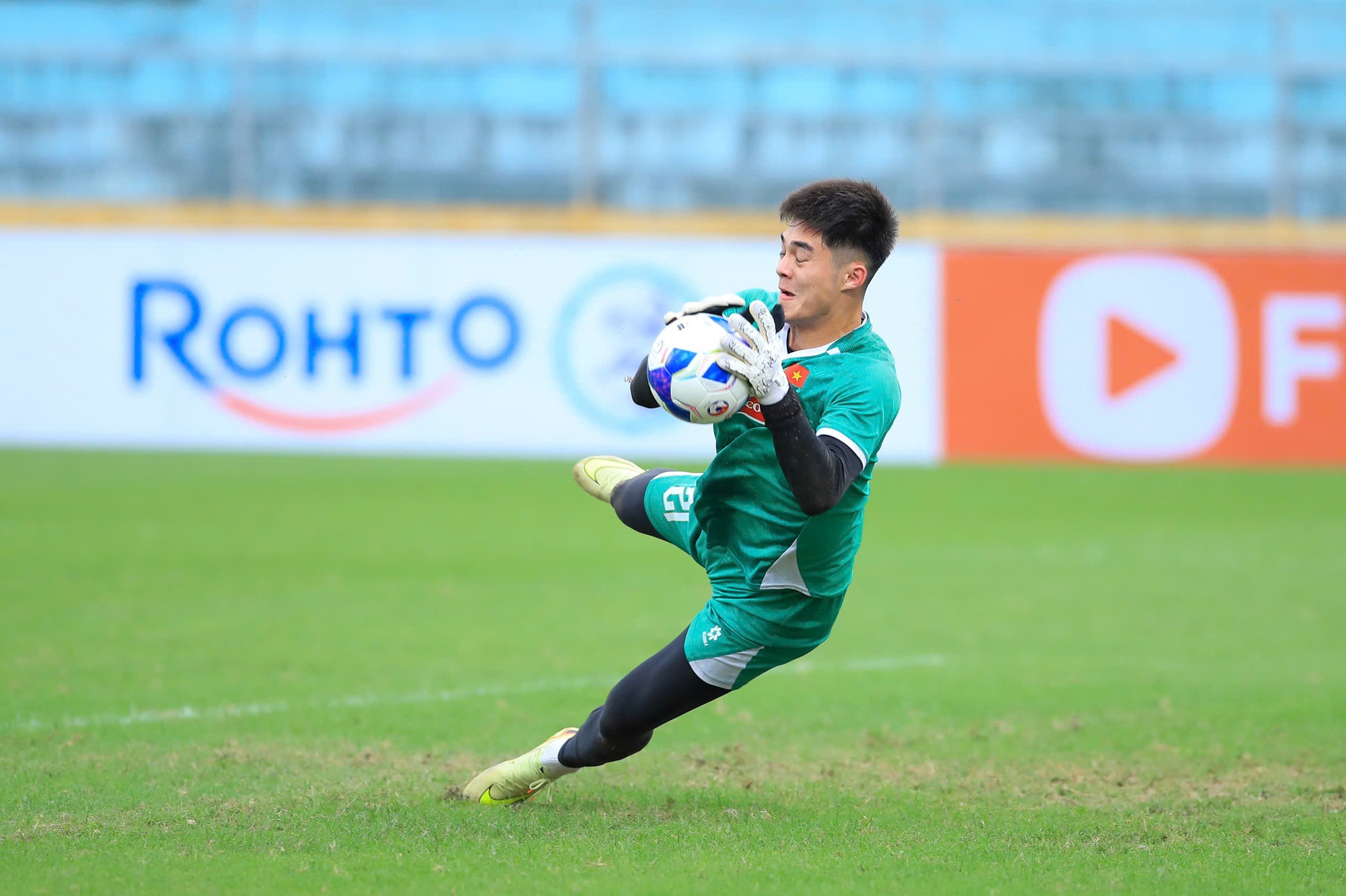 Ở khu vực riêng, ba thủ môn Đặng Văn Lâm, Nguyễn Filip và Trần Trung Kiên cũng miệt mài rèn luyện phản xạ và các kỹ năng đặc thù