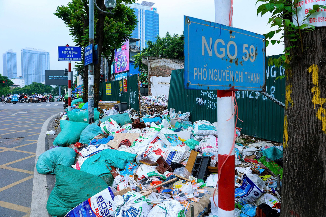 Rác thải được chất thành đống ngay trên vỉa hè đường vành đai 1 tại nút giao Nguyễn Chí Thanh.