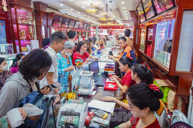 Hoạt động mua bán vàng tại một cửa hàng trên phố Trần Nhân Tông, Hà Nội, sáng 18/4. Ảnh: Duy Phạm.