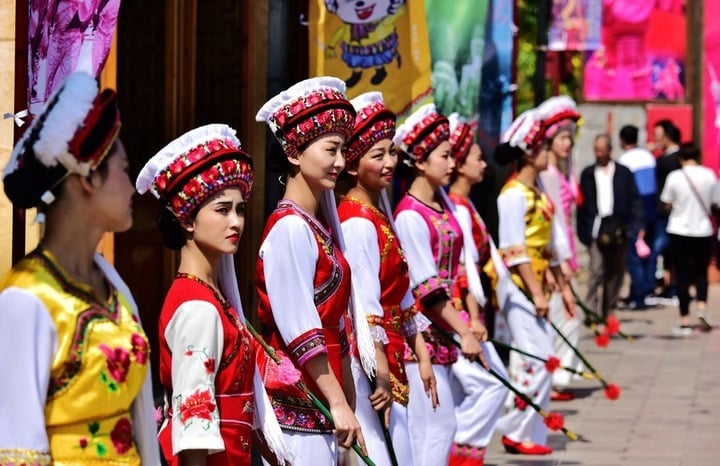 Phụ nữ dân tộc Bạch diện trang phục truyền thống trong lễ hội Nhiễu Tam Linh. (Ảnh: Baidu)