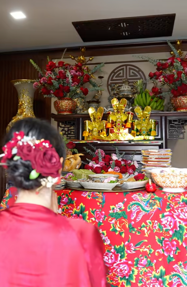 Sự đảm đang của phú bà Ngô Thùy Linh không dừng lại ở những việc "bề nổi". Những công việc tâm linh, đòi hỏi sự thành kính và cầu kỳ như việc chuẩn bị nước bao sái ban thờ, cô cũng không chọn cách mua sẵn. Cô tự tay đun nấu, chế biến theo công thức riêng, bởi với cô, sự chăm chút cho bàn thờ phải xuất phát từ tâm sức của người phụ nữ trong gia đình.