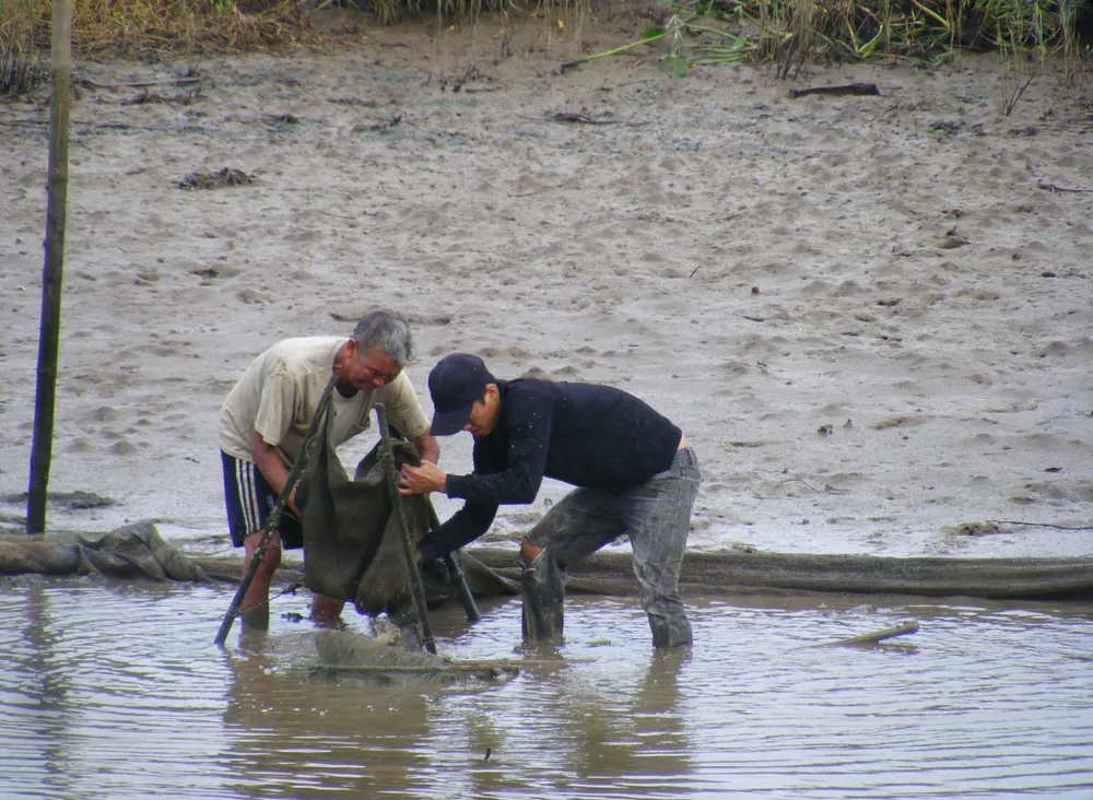 Công việc của chị Tiện là “đi săn” con bôm bốp - theo cách gọi của người dân địa phương. Đây là một loài thuộc họ nghêu. Khi thủy triều rút, bôm bốp ẩn mình dưới bùn. Nhưng qua “lỗ thở” của bôm bốp trên bề mặt bùn, người “đi săn” phát hiện ra và chỉ việc dùng tay bới bùn rồi bắt.