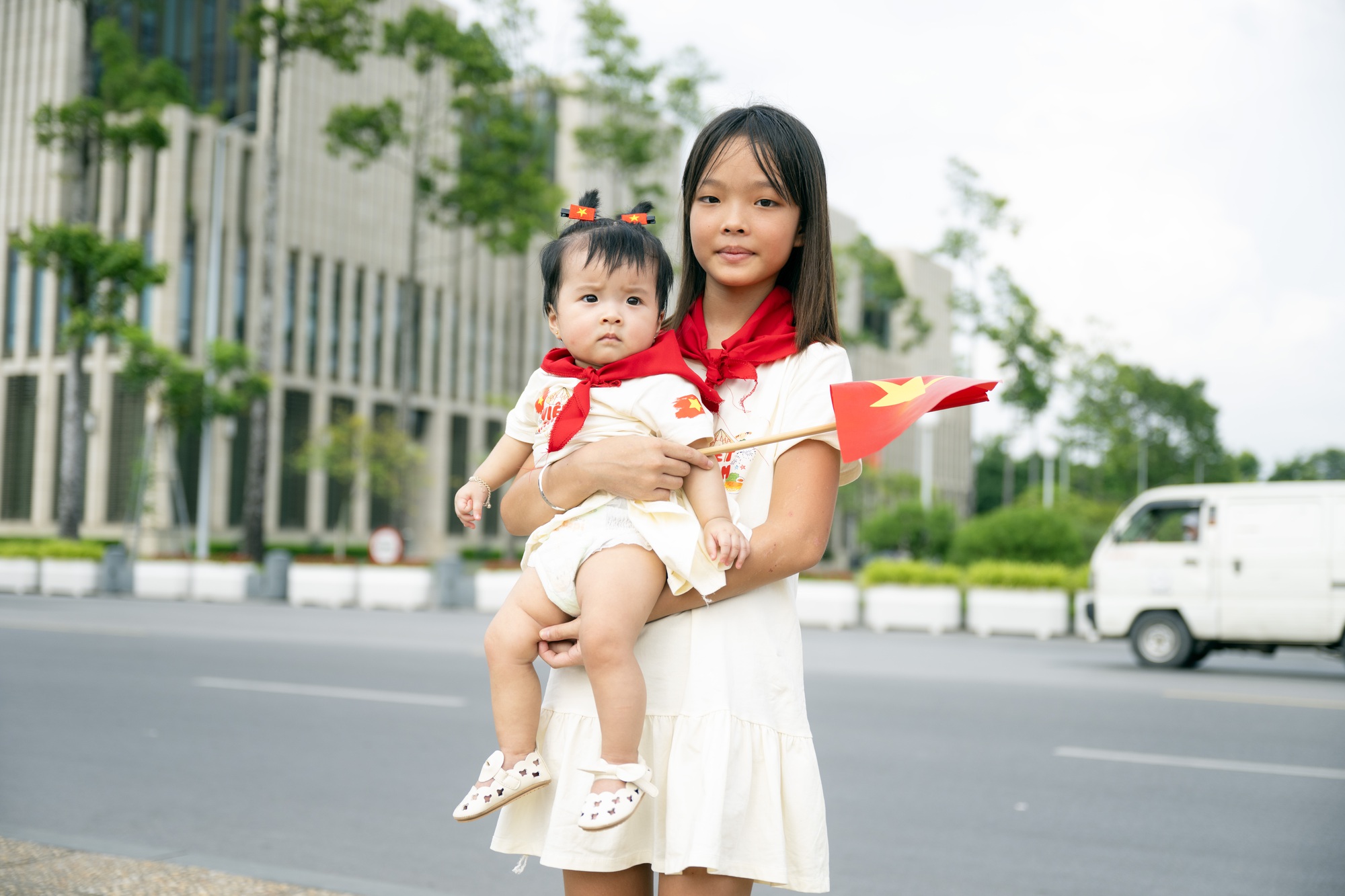 Bên cạnh hình ảnh những thiếu nữ trong tà áo dài thướt tha, nhiều phụ huynh và gia đình cũng đưa con, cháu đến Quảng trường Ba Đình trong dịp lễ lớn của dân tộc.