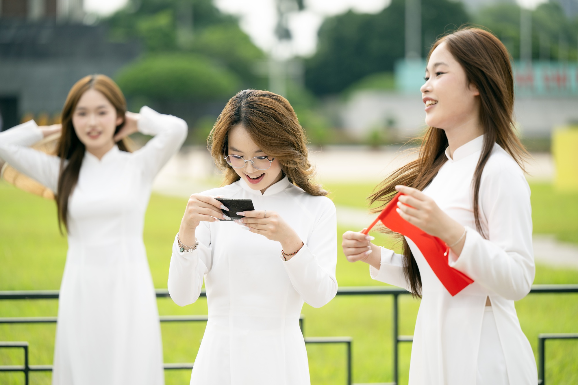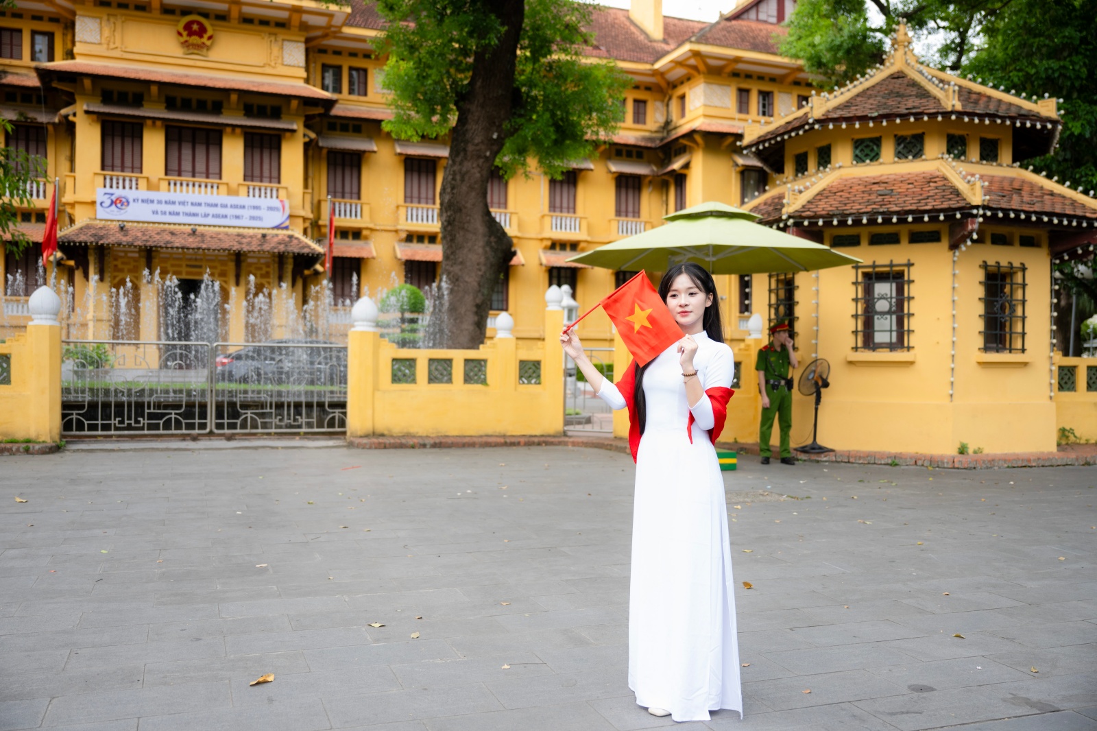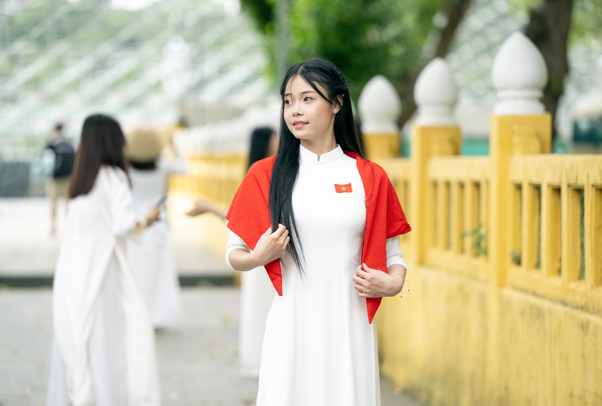 Thiếu nữ xúng xính trong tà áo dài cùng cờ đỏ sao vàng chụp ảnh trước Quảng trường Ba Đình.
