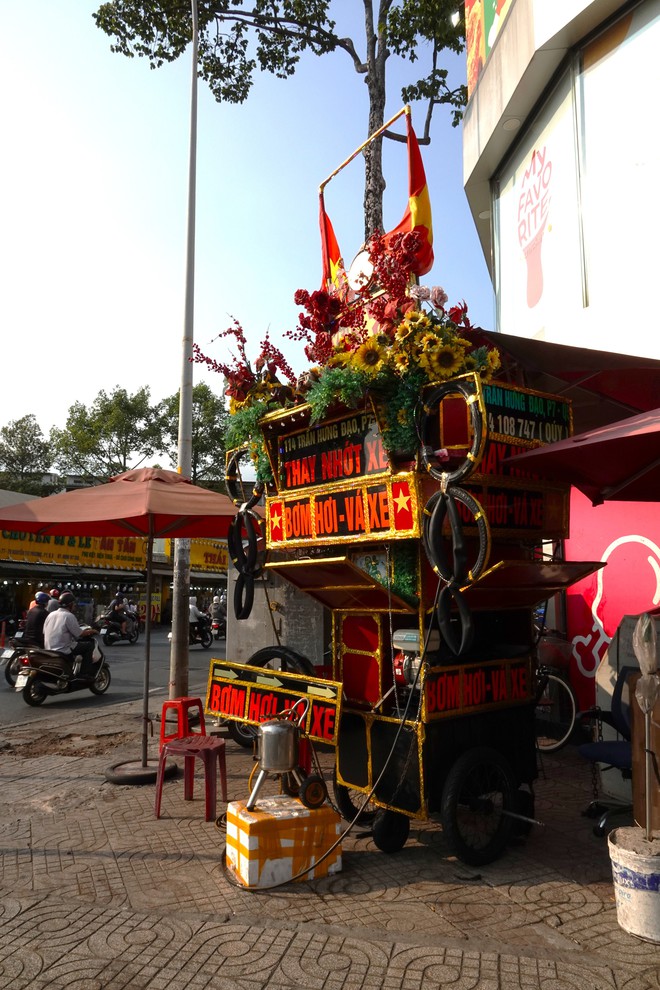 Ai đi ngang ngã tư Trần Hưng Đạo - Nguyễn Tri Phương (quận 5) chắc hẳn sẽ chú ý đến quầy sửa xe nổi bật với hoa và những biển hiệu rực rỡ. Chủ quầy - ông Trần Hữu Quý (62 tuổi) đã biến những món đồ nghề sửa xe vốn đơn giản thành điểm nhấn đặc biệt giữa phố phường.