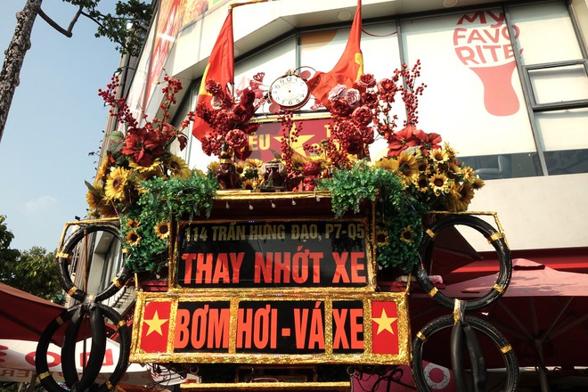 Ông Quý đã biến góc làm việc của mình thành con xe tông đỏ, trên gắn hoa, dòng chữ quảng cáo "bơm vá xe" cùng lá cờ Việt Nam bay phấp phới. Ngoài ra, ông còn khéo léo trang trí những chùm hoa xanh, đỏ, vàng đan cài vào nhau, gây sự hút mắt.