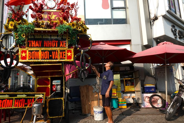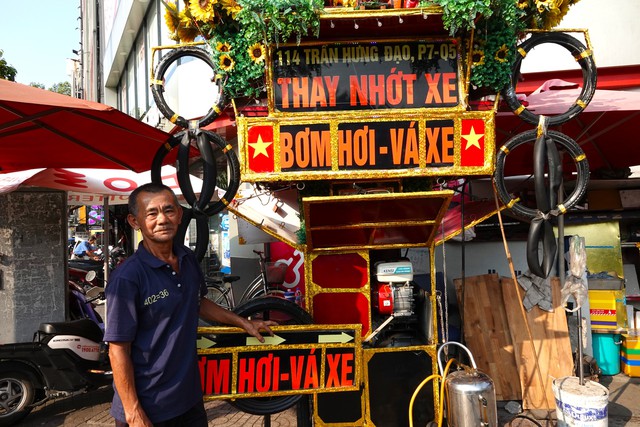 Ông Quý đã biến góc làm việc của mình thành con xe tông đỏ, trên gắn hoa, dòng chữ quảng cáo “bơm vá xe” cùng lá cờ Việt Nam bay phấp phới