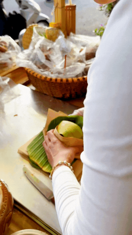 Gói xôi vừa chắc tay, vừa đẹp mắt, không hề vương vãi, cầm nóng hổi trên tay ai cũng thấy lòng ấm áp. Giá chỉ 15.000 đồng một gói nhưng khách xếp hàng mua không ngớt, đến nỗi nhiều người gọi vui đây là “quầy xôi xéo nổi như cồn” giữa phố phường Cần Thơ.