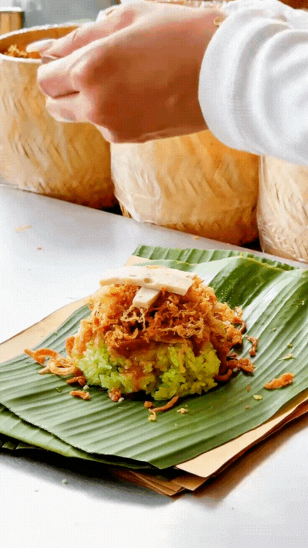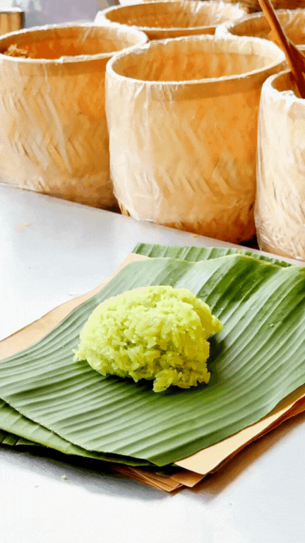 Khác với nhiều nơi nấu xôi xéo chỉ bằng nếp trắng, quầy xôi này lại chọn cách đồ nếp với lá dứa tươi. Nếp được ngâm qua đêm, trộn nước cốt lá dứa xay, khi đồ chín toả ra mùi thơm dìu dịu, xanh nhạt tự nhiên. Hạt nếp dẻo nhưng không nhão, tơi mà vẫn quyện.