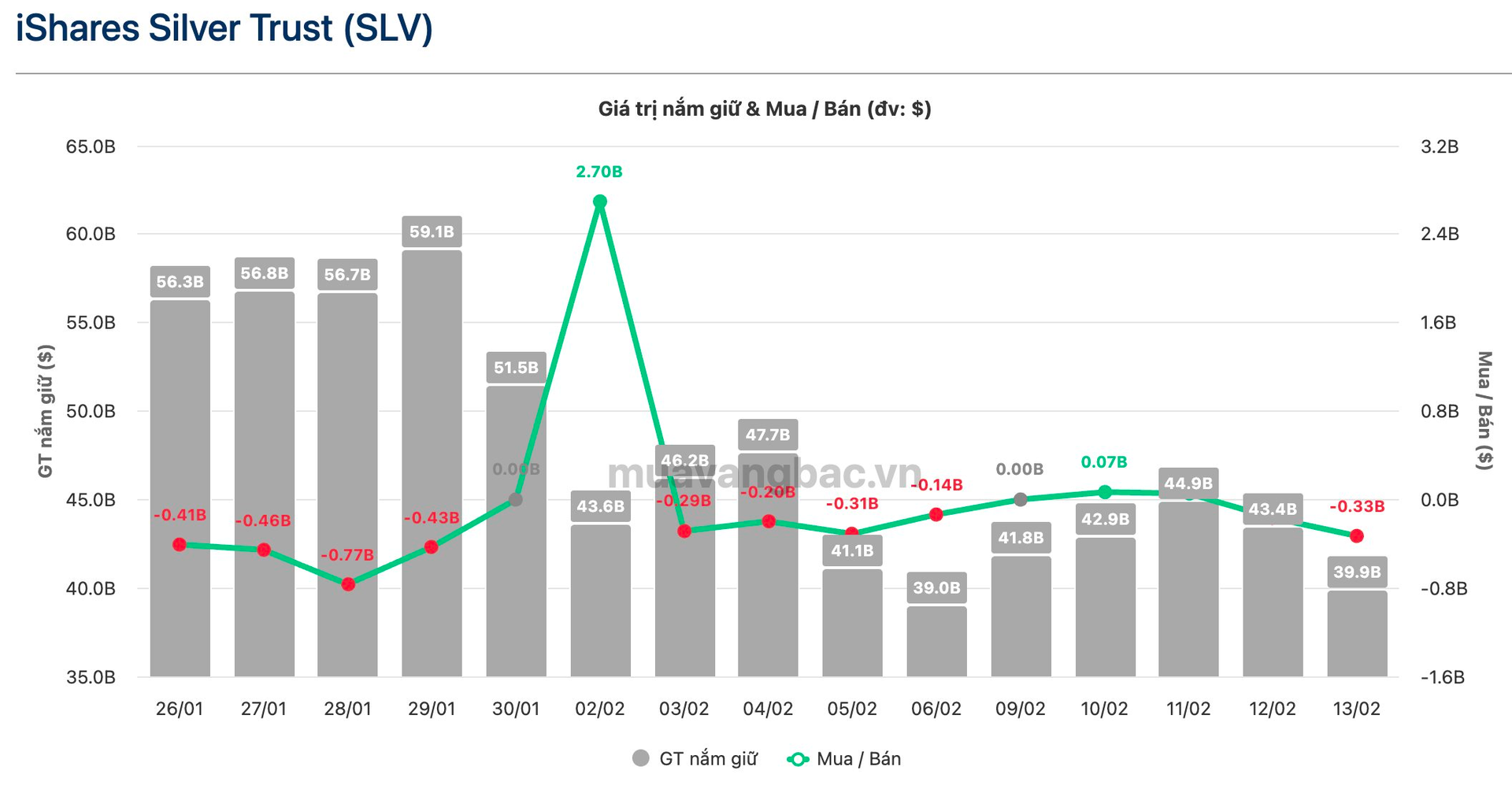 Theo cập nhật mới nhất từ muavangbac.vn, quỹ bạc lớn nhất thế giới iShare Silver Trust (SLV) do BlackRock đã bán ra lượng bạc có giá trị 329 triệu USD trong phiên 13/2 (khoảng 132 tấn bạc). Theo đó, hiện quỹ nắm giữ khoảng 16.030 tấn, quy mô giảm còn khoảng 40 tỷ USD.