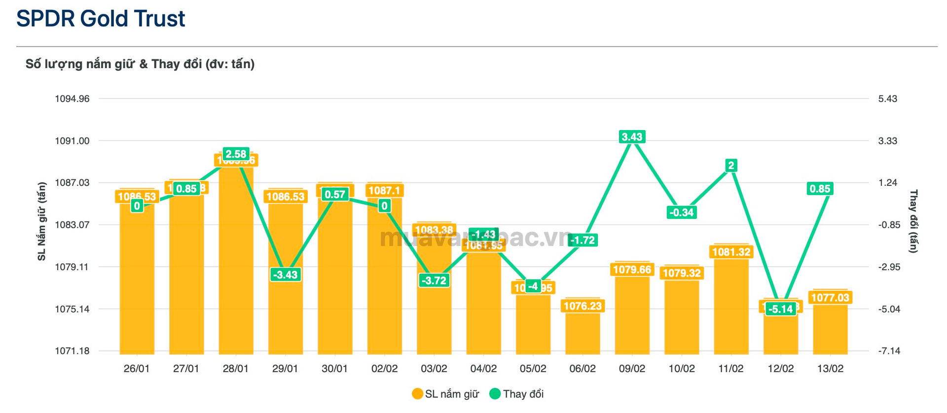 Theo dữ liệu từ muavangbac.vn, quỹ vàng lớn nhất thế giới SPDR Gold Trust đã mua vào 8,5 tạ bạc trong ngày 13/2 qua đó nâng tổng lượng nắm giữ lên trên 1.077 tấn, tương ứng quy mô khoảng 173 tỷ USD. Thời gian gần đây, quỹ đang có xu hướng bị rút vốn. Tính từ đầu tháng 2, SPDR đã bán ra khoảng 10 tấn vàng.