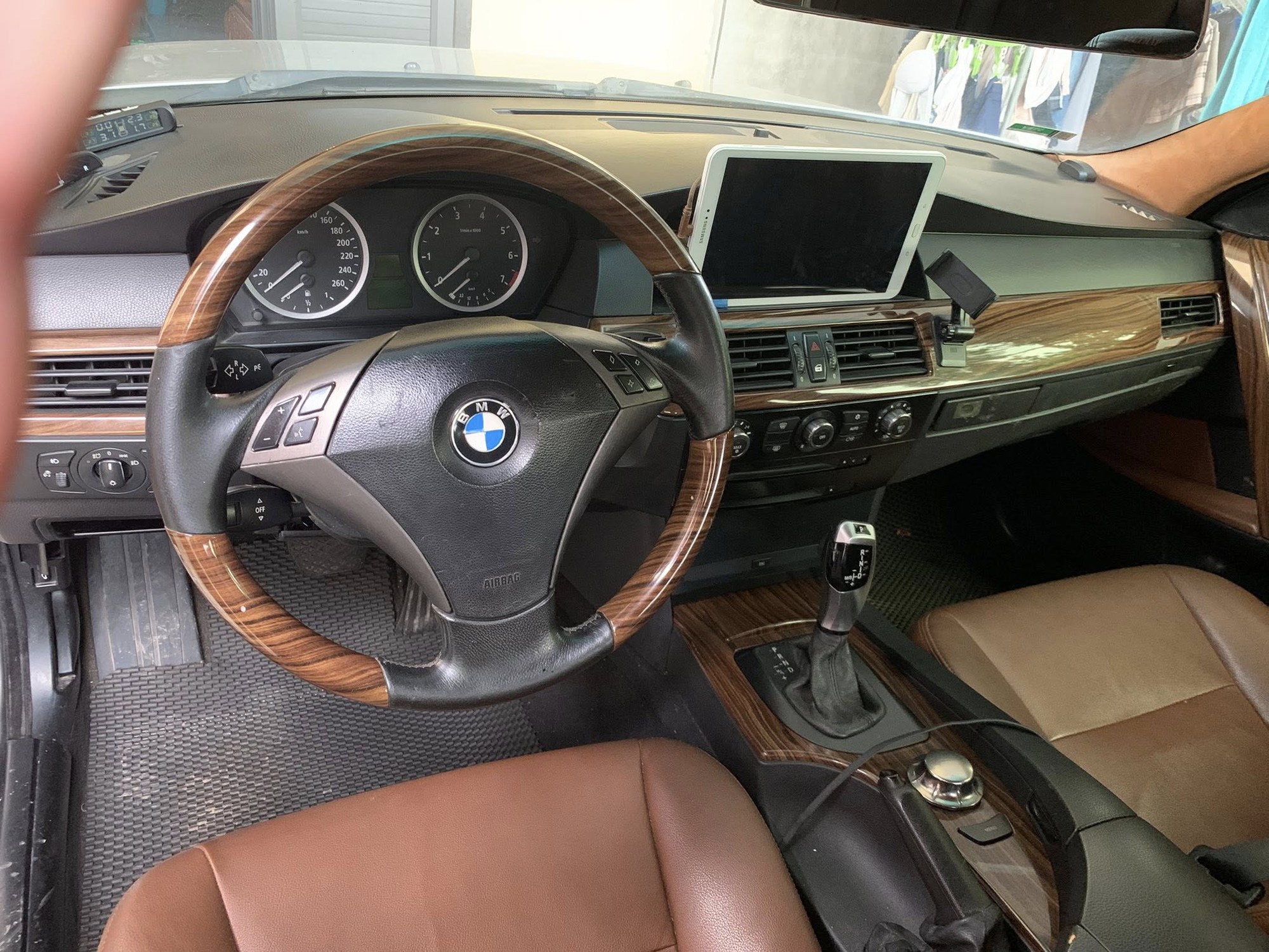 Bên trong nội thất chiếc BMW 525i 2004 rao bán sử dụng tông nâu chủ đạo, xen kẽ là các mảng gỗ ốp sáng màu. Cảm quan tình trạng ở mức khá, đỡ hơn ngoại thất khi chưa có nhiều dấu hiệu xuống cấp. Màn hình trung tâm do đã cũ, không có nhiều tiện ích giải trí nên chủ cũ đã gắn một máy tính bảng ở bảng táp-lô. Chưa hết, cần số nguyên bản là dạng cơ học nhưng chủ nhân đã thay thế phần tay cầm mới của loại cần số điện tử trên các mẫu BMW thế hệ mới hơn.