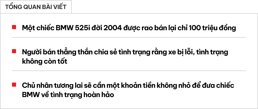 Một chiếc BMW 525i đời 2004 (mã E60) đang được rao bán trên thị trường xe cũ. Người bán chia sẻ thẳng thắn xe đang không ở trong tình trạng tốt nhất.