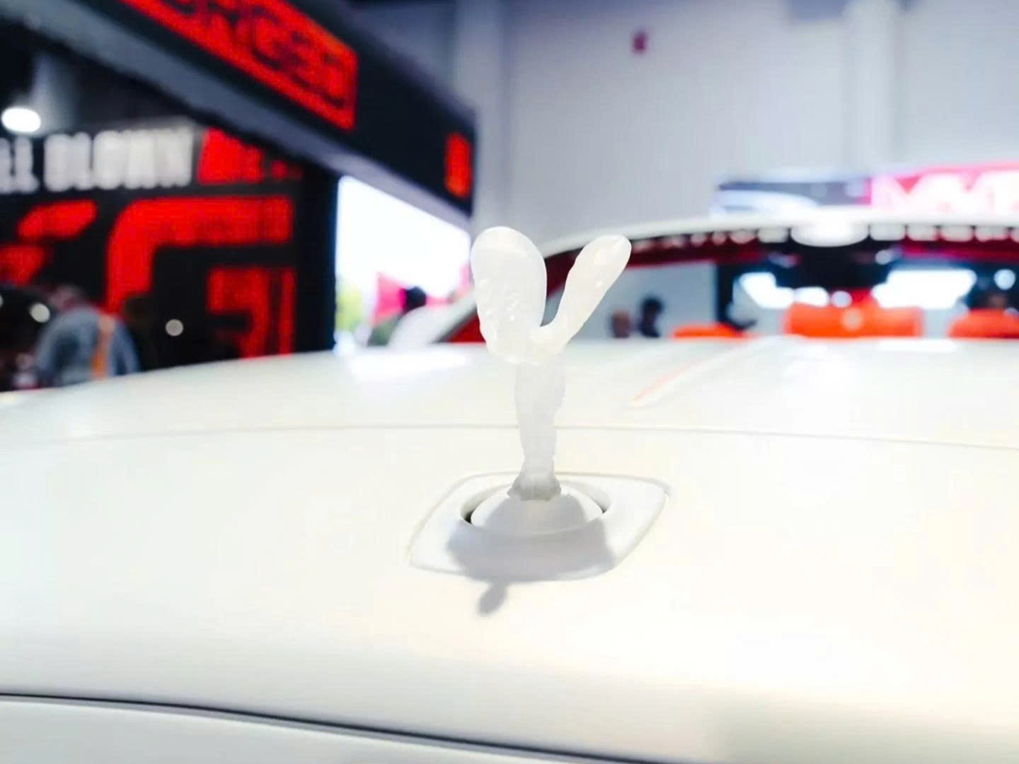 Sự thay đổi gây sốc nhất có lẽ nằm ở phần đầu xe. Venuum đã thay thế lưới tản nhiệt chrome mang tính biểu tượng của Rolls-Royce bằng một tấm nhựa trắng đục, đục lỗ bằng họa tiết hình học tam giác. Motif tương tự cũng xuất hiện trên các khe hút gió phía dưới được định hình lại. Hãng độ Venuum không chỉ dừng lại ở lưới tản nhiệt; một bộ đèn phụ tròn giờ đây nhô ra từ cản trước. Đồng thời, đèn pha nguyên bản bị che khuất một phần bởi bộ body kit. Ngay cả biểu tượng Spirit of Ecstasy cũng được tái hiện, nay khoác lên mình màu trắng, với huy hiệu Rolls-Royce màu cam tương phản.