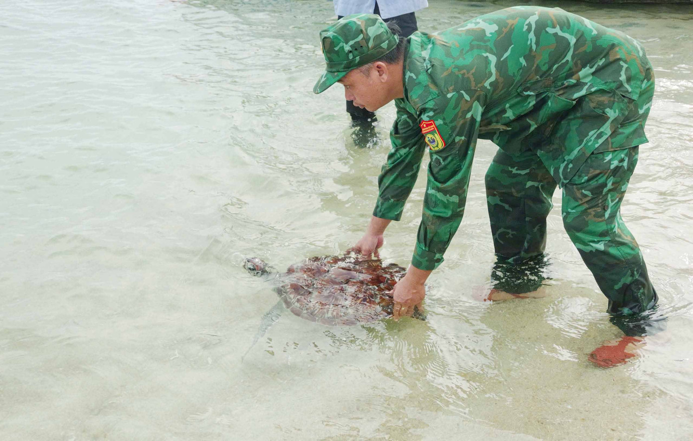 Ngày 12/8, Đồn Biên phòng Cửa khẩu cảng Liên Hương (thuộc Ban Chỉ huy Bộ đội Biên phòng tỉnh Lâm Đồng) phối hợp với Ban quản lý khu bảo tồn biển Hòn Cau thả 1 cá thể rùa biển quý hiếm thuộc họ Vích, nặng gần 12kg về môi trường sống tự nhiên.