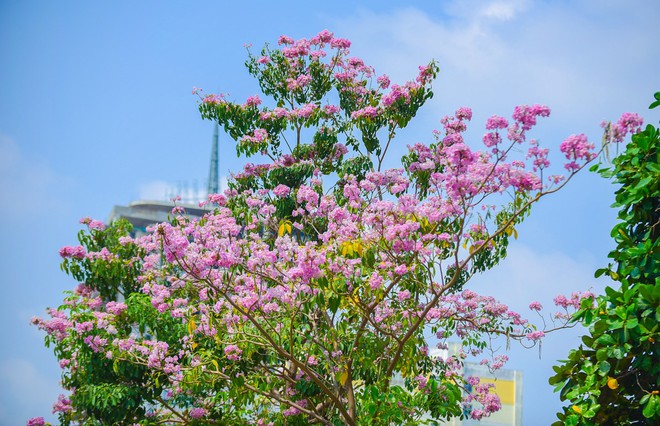 Trên đoạn đường Võ Văn Kiệt (quận 1), những bông hoa kèn hồng nở rực trên nền toà nhà Bitexco.