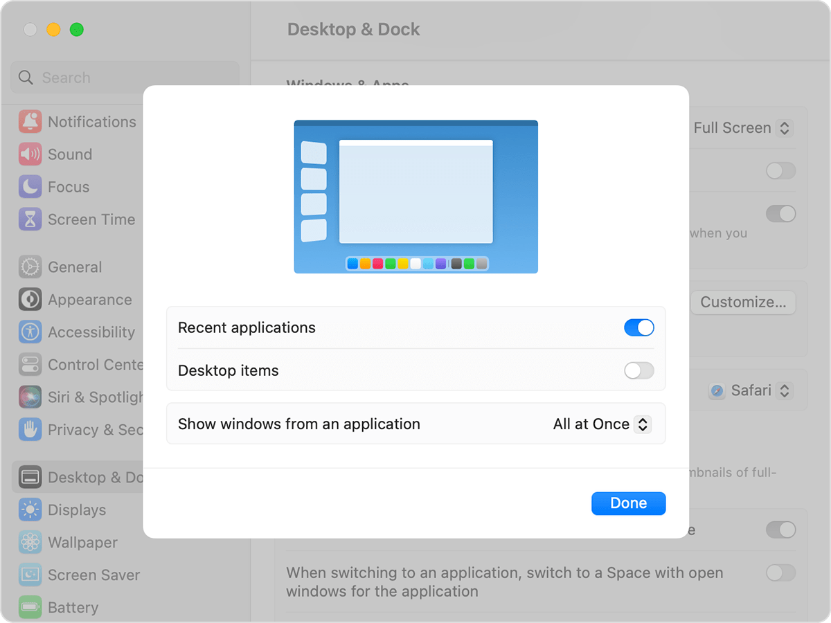 Chọn menu Apple > System Settings (Cài đặt hệ thống), sau đó nhấp vào máy tính để bàn & Dock trong thanh bên. Nhấp vào Tùy chỉnh bên cạnh ở bên phải Stage Manager