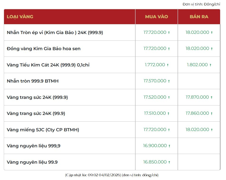 Tại thị trường trong nước, cập nhật lúc 9h sáng nay, giá vàng được các thương hiệu đồng loạt điều chỉnh tăng mạnh. SJC đang niêm yết giá vàng miếng mua vào - bán ra là 177,2 - 180,2 triệu đồng/lượng. Đây cũng là mức giá đang được Bảo Tín Mạnh Hải và Phú Quý niêm yết cho mặt hàng kim loại quý này.