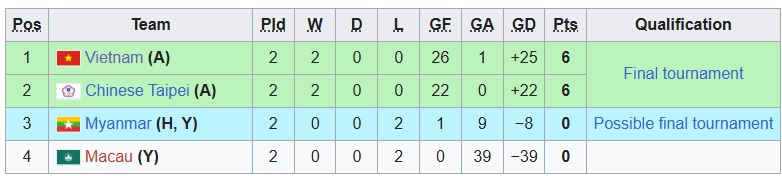 Với đại diện cuối cùng trong khu vực là Myanmar, nếu thắng Macau, họ vẫn cần chờ tất cả các bảng khác kết thúc mới biết mình có đi tiếp hay không, tuy nhiên cơ hội đang khá thấp.