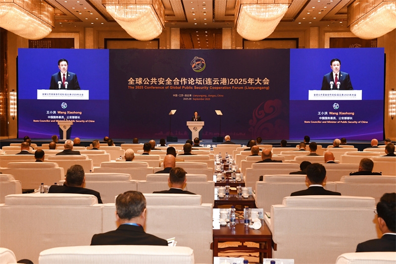 Bộ trưởng Bộ Công an Trung Quốc Vương Tiểu Hồng phát biểu tại lễ khai mạc Hội nghị Diễn đàn Hợp tác An ninh Công cộng Toàn cầu 2025. Ảnh: Tân Hoa Xã