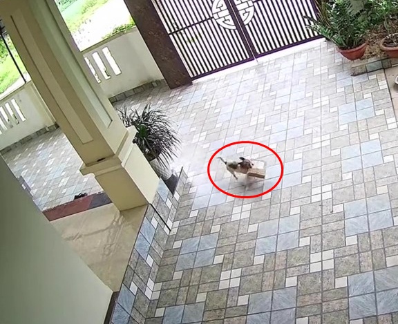 Hoá ra ngay sau khi đơn hàng được đặt xuống, chú cún trong nhà đã ngang nhiên xử lý thay chủ, ngậm luôn đơn hàng rồi tha đi. Hành động của chú cún diễn ra một cách chuyên nghiệp, bất chấp kích thước hộp hàng không nhỏ.