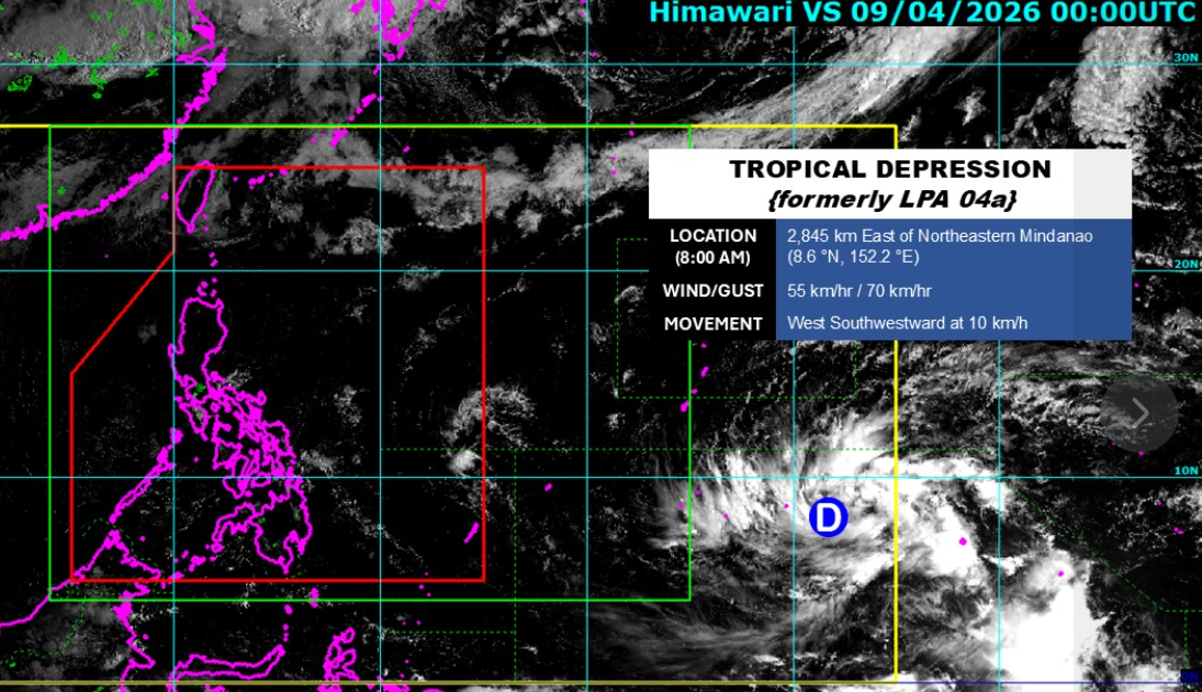 Theo cập nhật mới nhất tính đến 8:00 sáng nay (09/04/2026), áp thấp nhiệt đới (trước đó là vùng áp thấp LPA 04a) đang được Cục quản lý Thiên văn, Địa vật lý và Khí quyển Philippines (PAGASA) theo dõi chặt chẽ bên ngoài khu vực dự báo của quốc gia này.
