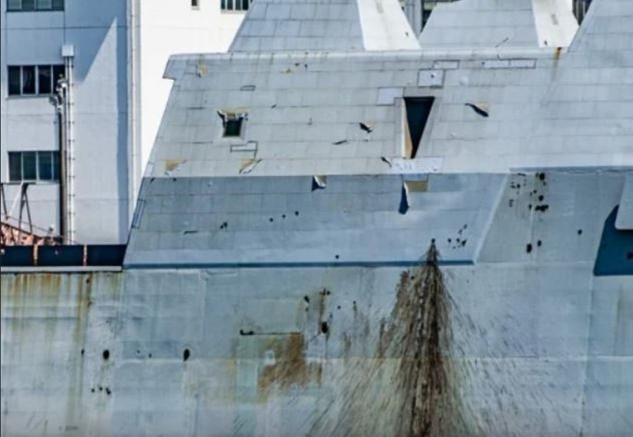 Những hình ảnh được đăng tải hôm 5 tháng 8 cho thấy tình trạng ăn mòn, đổi màu và hư hỏng bề mặt của thân tàu được làm từ composite đã dấy lên nghi ngờ về tình trạng hoạt động của một trong những tàu chiến tiên tiến nhất của Hải quân Mỹ, theo Military Watch.