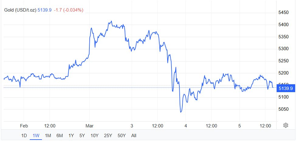 Giá vàng tuần qua. Nguồn: Trading Economics.