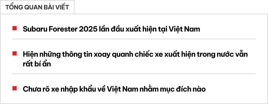 Một chiếc Subaru Forester thế hệ mới đã bị bắt gặp tại trung tâm thử nghiệm khí thải ở Hà Nội. Đây là lần đầu tiên thế hệ thứ 6 của mẫu xe này xuất hiện tại Việt Nam. Tuy nhiên, chưa rõ đây là xe nhập khẩu dưới dạng chính hãng hay phục vụ mục đích công vụ, bởi hiện nay Subaru Forester 2025 vẫn chưa được phía đại lý trong nước nhận đặt cọc.